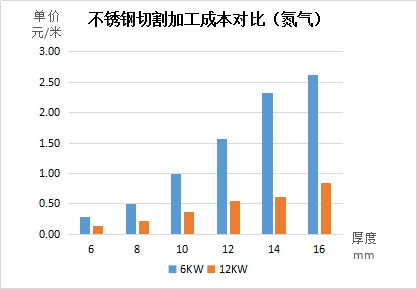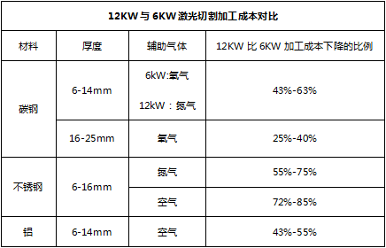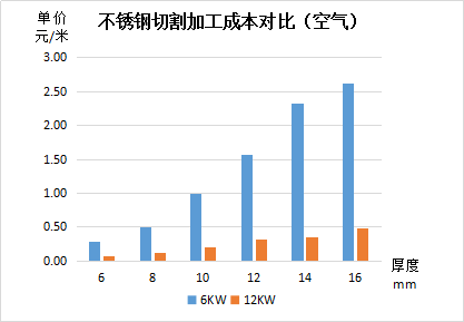 从以上数据可见:对比6KW激光加工成本,12kW激光切割成本基本都可以保持降低一半以上,其中不锈钢优势最大,其次是碳钢、铝。切割不锈钢时使用空气作为辅助气体,单价加工成本最 低,可以满足对切割端面要求不高的产品。